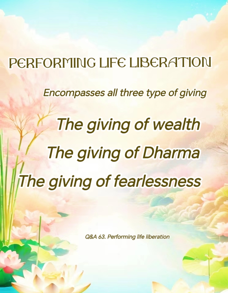 • Performing life liberations encompasses all three types of giving: the giving of wealth, the giving of Dharma, and the giving of fearlessness. Hence, it can help us attain immeasurable merits and virtues. The greatest benefits that we can receive from performing life liberations are the elimination of disasters and extension of our lifespans.